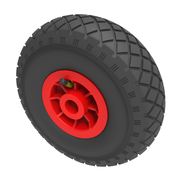 Black pneumatic tyre on red polypropylene centre rim with a plain bore. Fitted with a 4 ply diamond tread patterned tyre. Wheel diameter 260mm, tread width 85mm, hub 75mm, bore 25.4mm. Load capacity 120kg at 4KPH, REACH COMPLIANT. Not recommended for foam filling please take advise form the BIL Technical department or consider the BIL puncture proof range. for non-towing applications please note we manufacture to order and therefore a 24 hour delivery may not be possible.Important notice : Refer to rim for PSI rating not the tyre