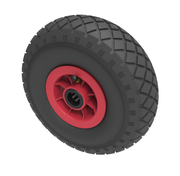 Black pneumatic tyre on red polypropylene centre rim with a roller bearing. Fitted with a 4 ply diamond tread patterned tyre. Wheel diameter 260mm, tread width 85mm, hub 75mm, bore 25mm. Load capacity 120kg at 4KPH, REACH COMPLIANT. Not recommended for foam filling please take advise from the BIL Technical department or consider the BIL puncture proof range. for non-towing applications please note we manufacture to order and therefore a 24 hour delivery may not be possible.Important notice : Refer to rim for PSI rating not the tyre