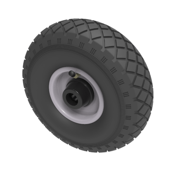 Black pneumatic tyre on grey steel rim centre with a roller bearing. Fitted with a 4 ply diamond tread patterned tyre. Wheel diameter 260mm, tread width 85mm, hub width 75mm, bore 25mm. Load capacity 200kg at 4KPH,REACH COMPLIANT. Not recommended for foam filling please take advise from the BIL Technical department or consider the BIL puncture proof range. for non-towing applications please note we manufacture to order and therefore a 24 hour delivery may not be possible.