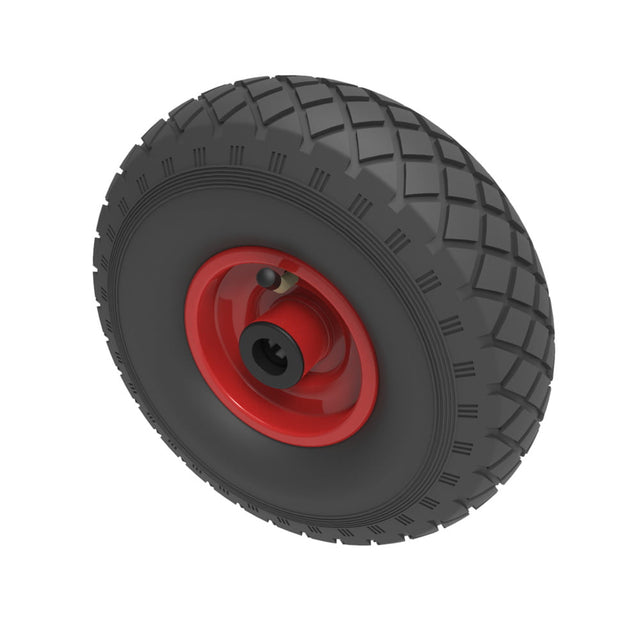 Black pneumatic tyre on red steel rim centre with a roller bearing. Fitted with a 6 ply diamond tread patterned tyre. Wheel diameter 260mm, tread width 85mm, hub width 65mm, bore 20mm. Load capacity 270kg at 4KPH,REACH COMPLIANT. Not recommended for foam filling please take advise from the BIL Technical department or consider the BIL puncture proof range. for non-towing applications please note we manufacture to order and therefore a 24 hour delivery may not be possible.