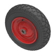 Black pneumatic tyred red steel disc centred wheel with sealed bearings. Fitted with a 4 ply block tread patterned tyre.Wheel diameter 400mm, tread width 100mm, hub 65mm, bore 25.4mm. Load capacity 200kg for non-towing applications.. Please note we manufacture to order and therefore a 24 hour delivery may not be possible.