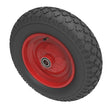 Black pneumatic tyred red steel disc centred wheel with sealed bearings. Fitted with a 4 ply block tread patterned tyre.Wheel diameter 400mm, tread width 100mm, hub 65mm, bore 25mm. Load capacity 200kg for non-towing applications.. Please note we manufacture to order and therefore a 24 hour delivery may not be possible.
