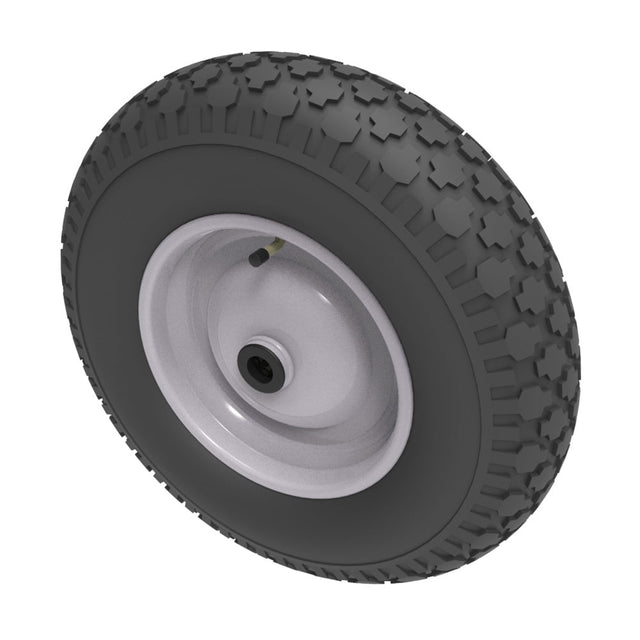 Black pneumatic tyre grey steel disc centred wheel with a roller bearing bore (sorry no grease nipple). Fitted with a 4 ply blocked tread patterned tyre. Wheel diameter 400mm, tread width 100mm, hub 75mm, bore 20mm. Load capacity 200kg for non-towing applications please note we manufacture to order and therefore a 24 hour delivery may not be possible.