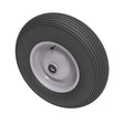 Black pneumatic tyred grey steel disc centred wheel with a roller bearing bore (sorry no grease nipple). Fitted with a 4 ply ribbed tread patterned tyre. Wheel diameter 400mm, tread width 100mm, hub 75mm, bore 25.4mm. Load capacity 250kg for non-towing applications please note we manufacture to order and therefore a 24 hour delivery may not be possible REACH COMPLIANT Please note these wheels are not suitable for foam filling as standard. Please ask about an upgrade using our Butyl inner tubes to suit this purpose or otherwise consider our puncture proof range of wheels.