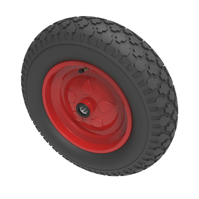 Black pneumatic tyred red steel disc centred wheel with a roller bearing bore (sorry no grease nipple). Fitted with a 4 ply blocked tread patterned tyre. Wheel diameter 400mm, tread width 100mm, hub 65mm, bore 25.4mm. Load capacity 200kg for non-towing applications. Please note we manufacture to order and therefore a 24 hour delivery may not be possible.