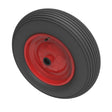 Black pneumatic tyred red steel disc centred wheel with a roller bearing bore (sorry no grease nipple). Fitted with a 4 ply ribbed tread patterned tyre. Wheel diameter 400mm, tread width 100mm, hub 65mm, bore 25mm. Load capacity 200kg for non-towing applications. REACH Compliant. Please note we manufacture to order and therefore a 24 hour delivery may not be possible Please note these wheels are not suitable for foam filling as standard. Please ask about an upgrade using our Butyl inner tubes to suit this purpose or otherwise consider our puncture proof range of wheels.