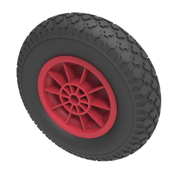 Black pneumatic tyre on red polypropylene centre rim with a plain bore. Fitted with a 4 ply block tread patterned tyre. Wheel diameter 400mm, tread width 100mm, hub 66mm, bore 25.4mm. Load capacity 200kg at 4KPH, for non-towing applications please note we manufacture to order and therefore a 24 hour delivery may not be possible.Important notice : Refer to rim ing not the tyre