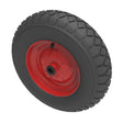 Black pneumatic tyred red steel disc centred wheel with a roller bearing bore (sorry no grease nipple). Fitted with a 4 ply diamond tread patterned tyre. Wheel diameter 400mm, tread width 100mm, hub 65mm, bore 20mm. Load capacity 300kg for non-towing applications. REACH Compliant. Please note we manufacture to order and therefore a 24 hour delivery may not be possible Please note these wheels are not suitable for foam filling as standard. Please ask about an upgrade using our Butyl inner tubes to suit this purpose or otherwise consider our puncture proof range of wheels.