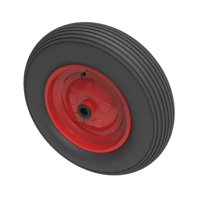 Black pneumatic tyred red steel disc centred wheel with a roller bearing bore (sorry no grease nipple). Fitted with a 4 ply ribbed tread patterned tyre. Wheel diameter 400mm, tread width 100mm, hub 65mm, bore 20mm. Load capacity 300kg for non-towing applications. REACH Compliant. Please note we manufacture to order and therefore a 24 hour delivery may not be possible Please note these wheels are not suitable for foam filling as standard. Please ask about an upgrade using our Butyl inner tubes to suit this purpose or otherwise consider our puncture proof range of wheels.