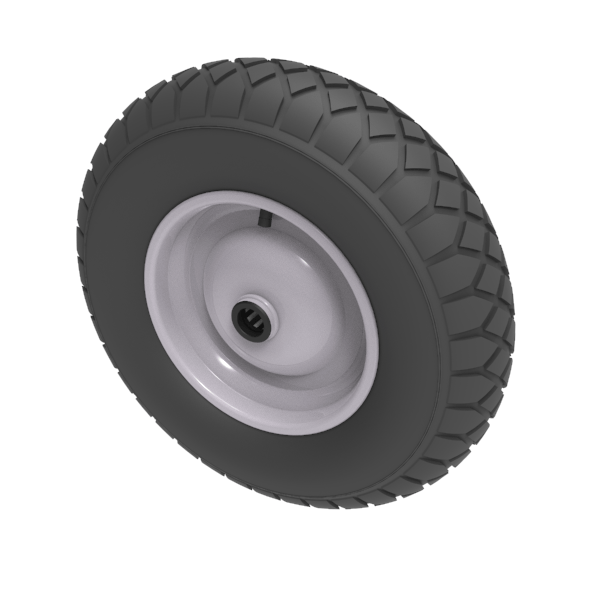 Black pneumatic tyred grey steel disc centred wheel with a roller bearing bore (sorry no grease nipple). Fitted with a 4 ply diamond tread patterned tyre. Wheel diameter 400mm, tread width 100mm, hub 75mm, bore 25.4mm. Load capacity 300kg for non-towing applications. REACH Compliant. Please note we manufacture to order and therefore a 24 hour delivery may not be possible. Please note these wheels are not suitable for foam filling as standard. Please ask about an upgrade using our Butyl inner tubes to suit this purpose or otherwise consider our puncture proof range of wheels.