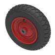Black pneumatic tyred red steel disc centred wheel with ball bearings (sorry no grease nipple). Fitted with a 6 ply diamond tread patterned tyre. Wheel diameter 400mm, tread width 100mm, hub 65mm, bore 25mm. Load capacity 350kg for non-towing applications. REACH Compliant. Please note we manufacture to order and therefore a 24 hour delivery may not be possible.. Please note these wheels are not suitable for foam filling as standard. Please ask about an upgrade using our Butyl inner tubes to suit this purpose or otherwise consider our puncture proof range of wheels.