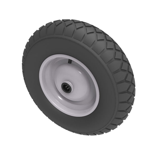 Black pneumatic tyred grey steel disc centred wheel with a roller bearing bore (sorry no grease nipple). Fitted with a 6 ply diamond tread patterned tyre. Wheel diameter 400mm, tread width 100mm, hub 75mm, bore 25.4mm. Load capacity 350kg for non-towing applications. REACH Compliant. Please note we manufacture to order and therefore a 24 hour delivery may not be possible. Maximum SWL are quoted according to speed: higher speed will reduce SWL. Load capacities recorded on tyre walls represent manufacturers recommended maximum load at 10 KPH, whilst higher SWL figures stated within our catalogue are based upon 4kph maximum speeds. Refer to our catalogue for SWL if the wheel is never to be used at over 4kph rather than the figure recorded on the tyre. Always check the intended application and base the required SWL capacity according to speed rating. If you have any doubts then please contact BIL before using these wheels. Please note these wheels are not suitable for foam filling as standard. Please ask about an upgrade using our Butyl inner tubes to suit this purpose or otherwise consider our puncture proof range of wheels.