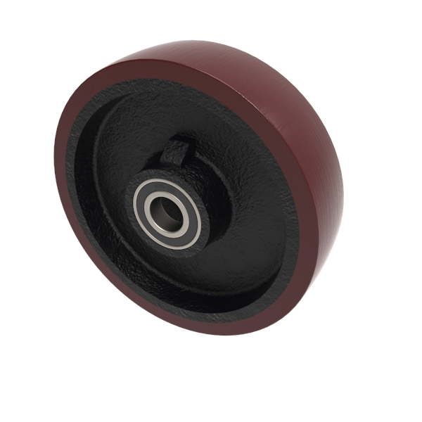 Brown polyurethane tyre on cast iron centred wheel with ball bearing. Diameter 300mm, tread width 50mm, bore size 25.4mm, hub length 60mm.Load capacity 1400kg.