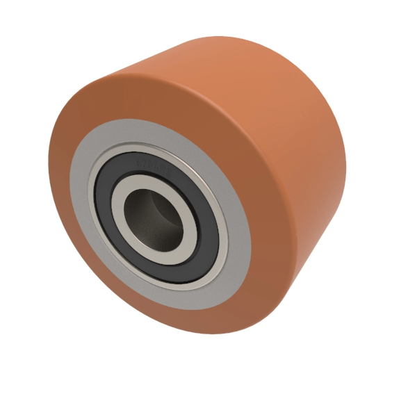 82mm brown polyurethane tyred on steel centred pallet roller with 20mm 2RS ball bearings tread width 50mm. Load capacity 650kg.