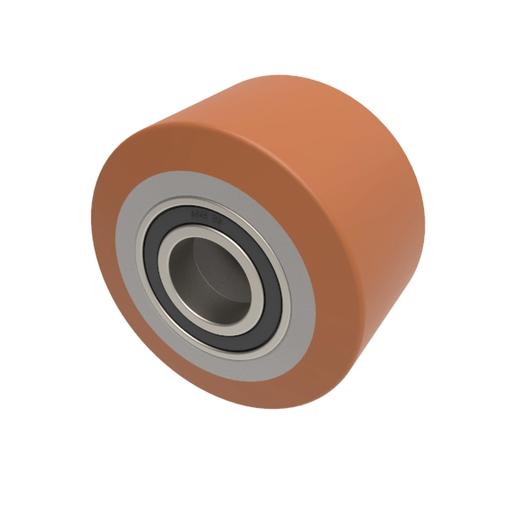 82mm brown polyurethane tyred on steel centred pallet roller with 25mm 2RS ball bearings tread width 50mm. Load capacity 650kg.
