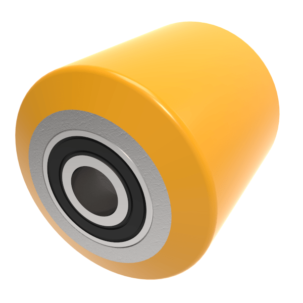 82mm brown polyurethane tyred on steel centred pallet roller with 17mm 6003 2RS ball bearings tread width 75mm. Load capacity 700kg.