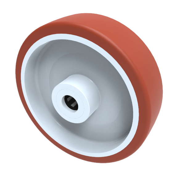 Brown polyurethane tyre on white nylon centred wheel with roller bearing. Diameter 125mm, tread width 35mm, bore size 15mm hub length 44mm Load capacity 230kg.