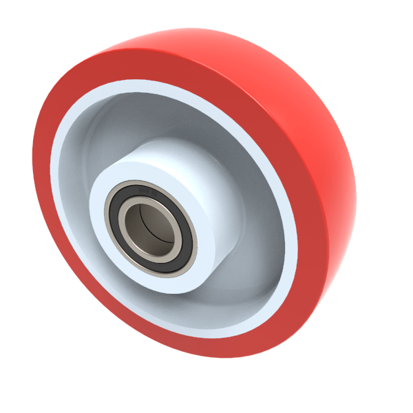 Red polyurethane tyred nylon centred ball bearing. Wheel diameter 150mm, tread width 40mm, bore size 25mm, hub length 58mm. Load capacity 500kg.