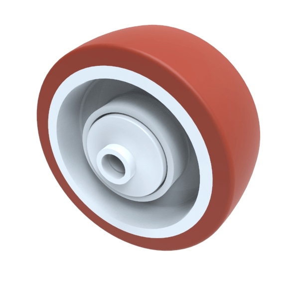 Brown polyurethane tyre on white nylon centred wheel with a single ball bearing with retaining caps. Diameter 80mm, tread width 30mm, bore size 8mm hub length 40mm Load capacity 120kg.