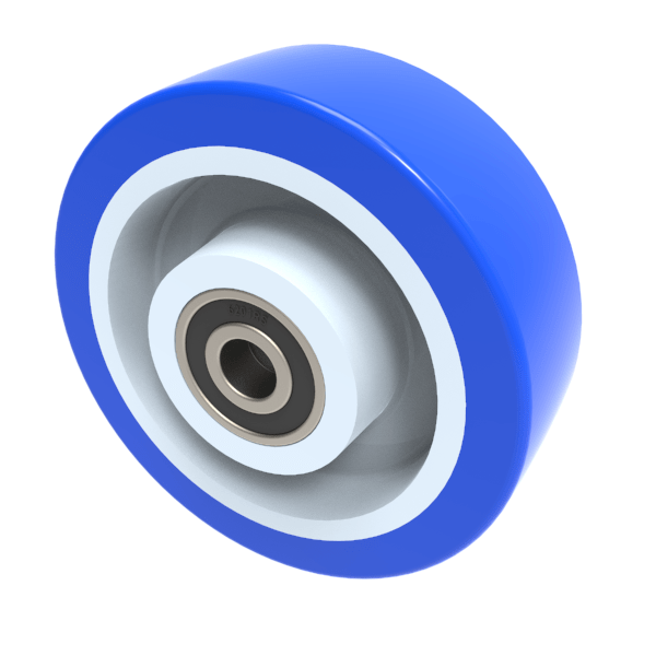 Blue 82 shore hardness polyurethane tyred nylon centred ball bearing. Wheel diameter 100mm, tread width 32mm, bore size 12mm, hub length 40mm. Load capacity 250kg.