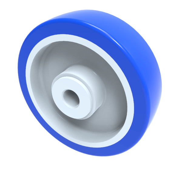 Blue 82 shore A hardness polyurethane tyred nylon centred plain bore. Wheel diameter 125mm, tread width 35mm, bore size 15mm, hub length 45mm. Load capacity 300kg.
