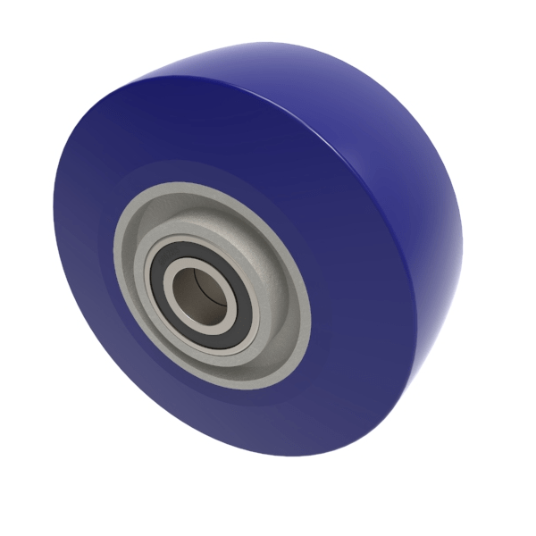 100mm diameter Blue 75 Shore A polyurethane tyre on an aluminium centred wheel with ball bearings. Tread width 40mm, bore 15mm, hub 45mm. Load capacity 300kg