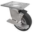 Fabricated swivel castor with a top plate fixing fitted with a black high elastic 65 shore A rubber tyre with aluminium centre wheel with ball bearings and a side fitting wheel brake. Wheel diameter 100mm, tread width 50mm, overall height 143mm, top plate 135mm x 110mm, hole centres 105mm x 80mm. Load capacity 250kg. REACH compliant also PAH-Free rubber to confirm to EU-directive 2005/69/EC
