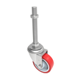 Pressed steel swivel castor with a M20 x150mm adjustable stem fitted with a red polyurethane tyre on white nylon centred wheel with roller bearing. Wheel diameter 100mm, tread width 33mm, overall height 128mm. Load capacity 250kg.